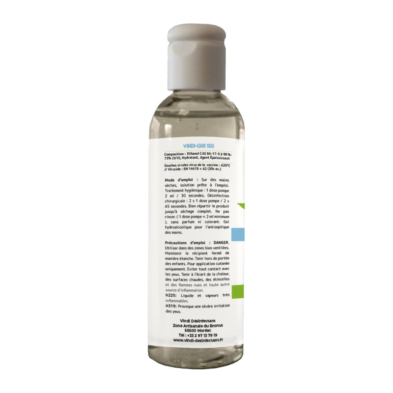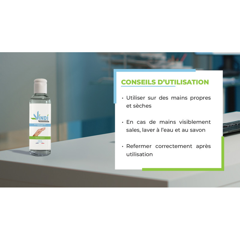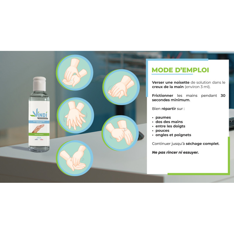 Il faut qu'une fois que la répartition du gel sur les mains est homogène, bien laisser sécher naturellement. En acceptant cette pellicule de protection essentielle sur les mains, afin d'optimiser les propriétés virucides (EN14476+A2) et hydratante du gel hydroalcoolique VINDI Désinfectant.