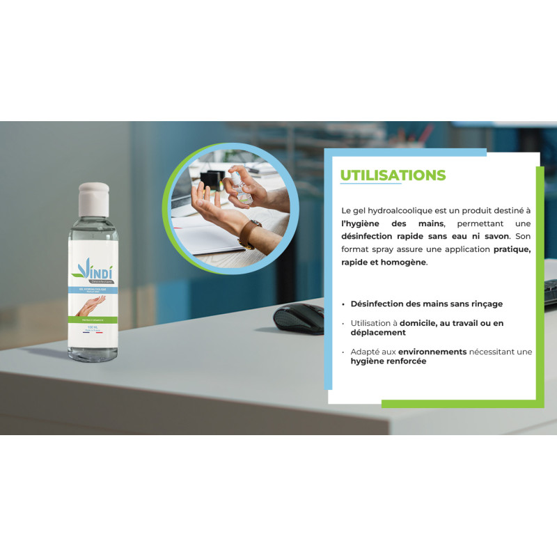 Le gel hydroalcoolique a des propriétés bactéricides, virucides et fongicides, sans effet nettoyant. Elles doivent être appliquées sur des mains sèches et non souillées.