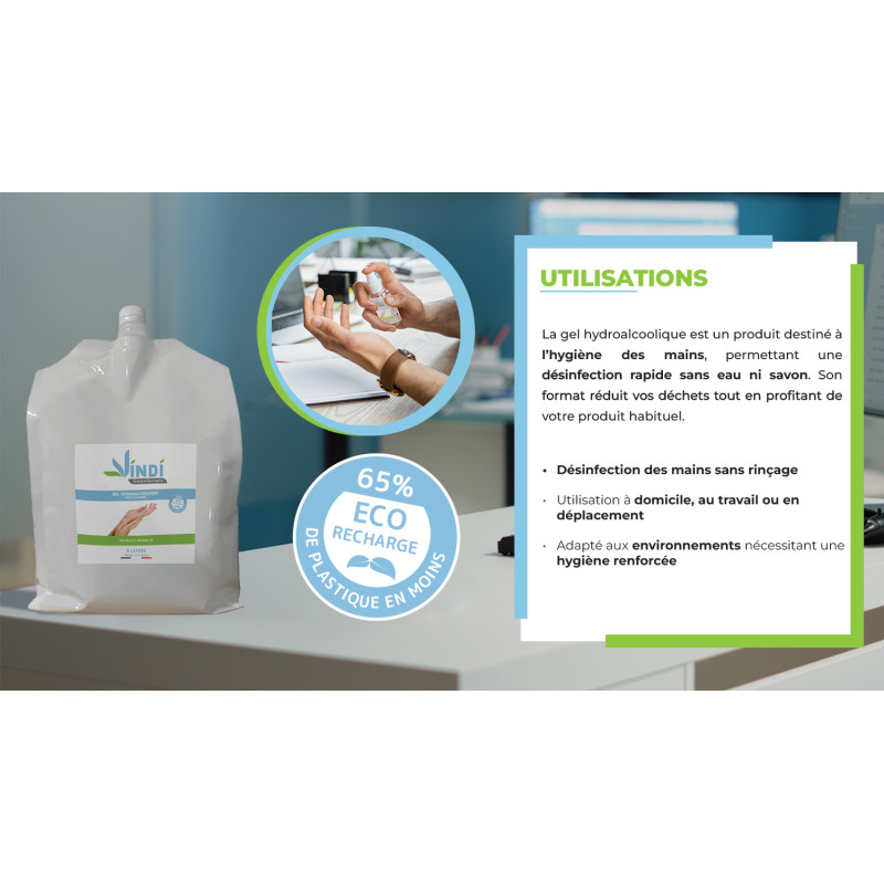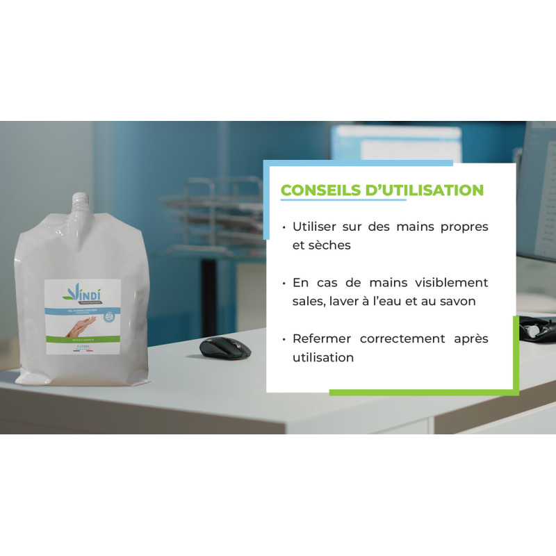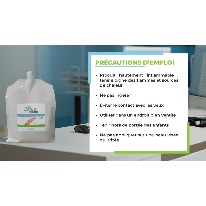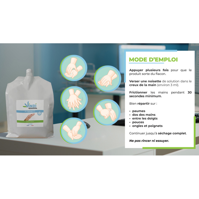 Il faut qu'une fois que la répartition du gel sur les mains est homogène, bien laisser sécher naturellement. En acceptant cette pellicule de protection essentielle sur les mains, afin d'optimiser les propriétés virucides (EN14476+A2) et hydratante du gel hydroalcoolique VINDI Désinfectant.
