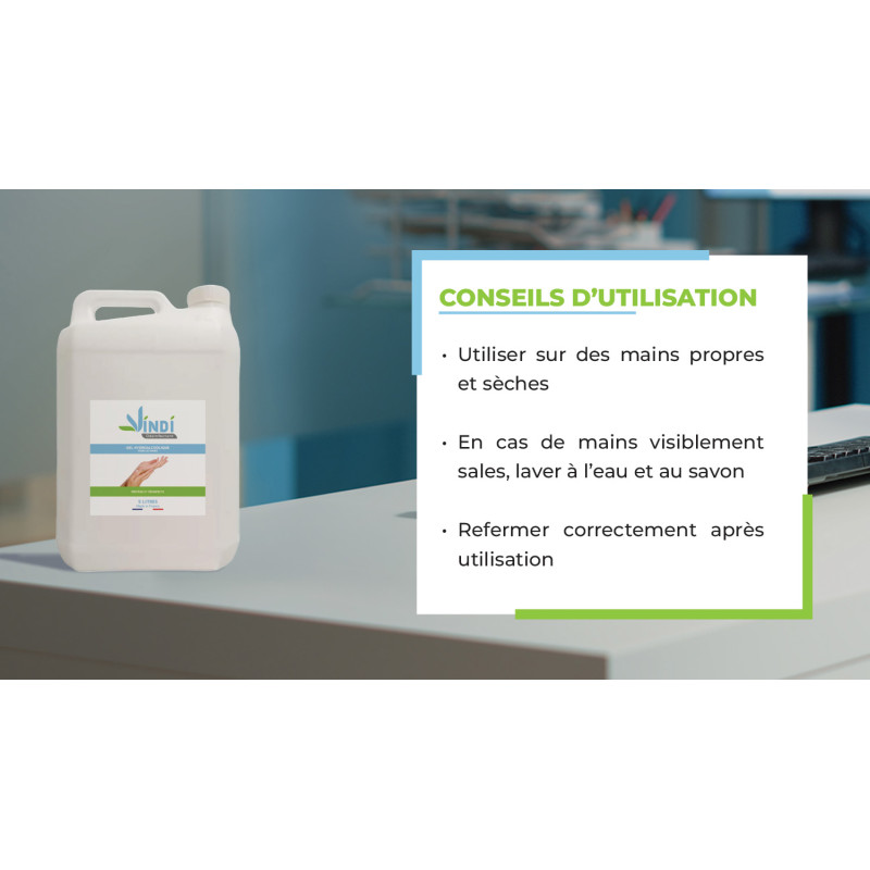 Il faut qu'une fois que la répartition du gel sur les mains est homogène, bien laisser sécher naturellement. En acceptant cette pellicule de protection essentielle sur les mains, afin d'optimiser les propriétés virucides (EN14476+A2) et hydratante du gel hydroalcoolique VINDI Désinfectant.