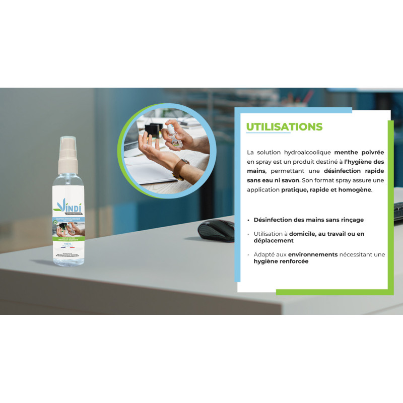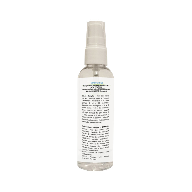 Composition : Ethanol 96%, Peroxyde d'hydrogène 3%, Hydratant, huile essentielle de menthe poivrée BIO