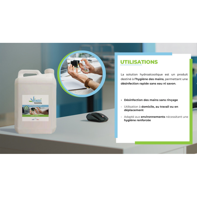 Les solutions hydroalcooliques ont des propriétés bactéricides, virucides et fongicides, sans effet nettoyant. Elles doivent être appliquées sur des mains sèches et non souillées.