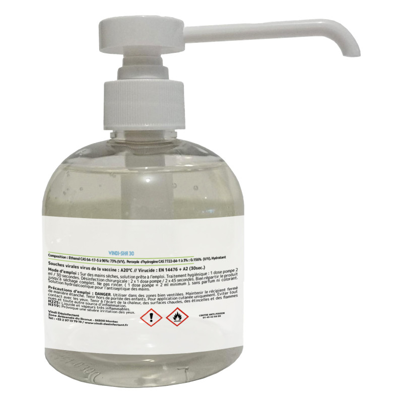 VINDI-SHA 30 : Solution hydroalcoolique. CONSERVATION AVANT OUVERTURE Stockage +5°C à +25°C : 2 ans à partir de la date de réalisation. CONSERVATION APRES OUVERTURE VINDI-SHA 30 est une solution hydroalcoolique qui se conserve 3 mois après ouverture. | ![]() |