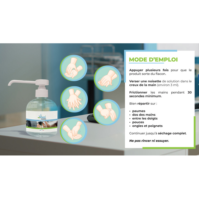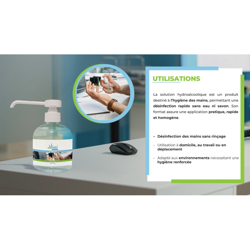 Les solutions hydroalcooliques ont des propriétés bactéricides, virucides et fongicides, sans effet nettoyant. Elles doivent être appliquées sur des mains sèches et non souillées.