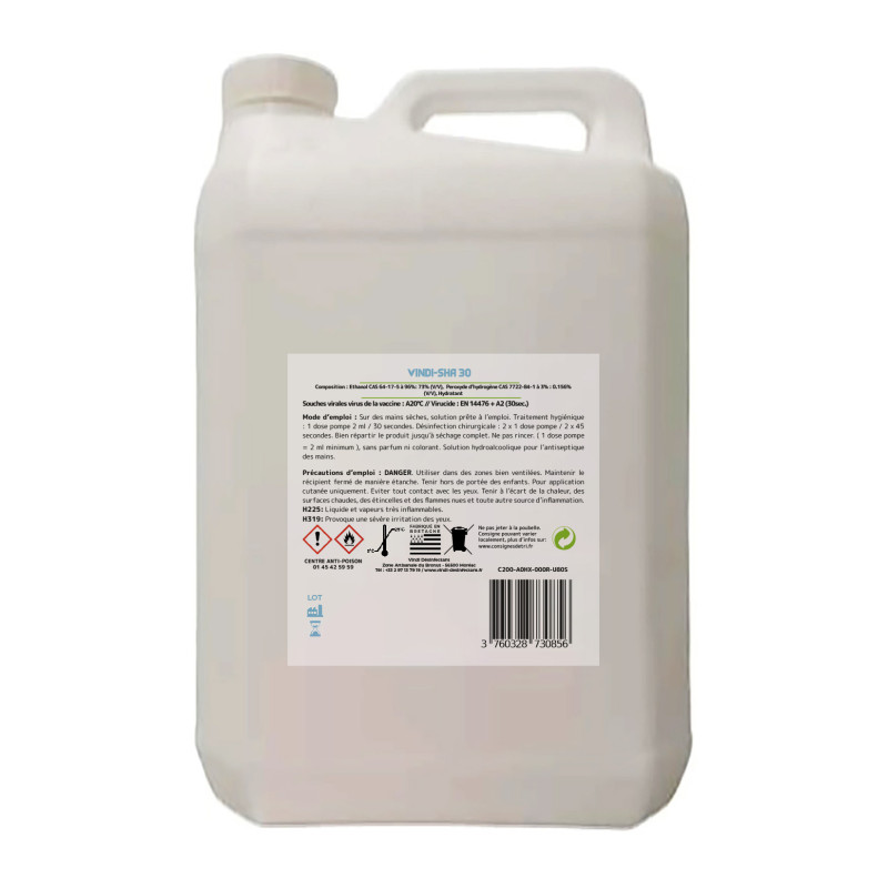 VINDI-SHA 30 : Solution hydroalcoolique. CONSERVATION AVANT OUVERTURE Stockage +5°C à +25°C : 2 ans à partir de la date de réalisation. CONSERVATION APRES OUVERTURE VINDI-SHA 30 est une solution hydroalcoolique qui se conserve 3 mois après ouverture. | ![]() |